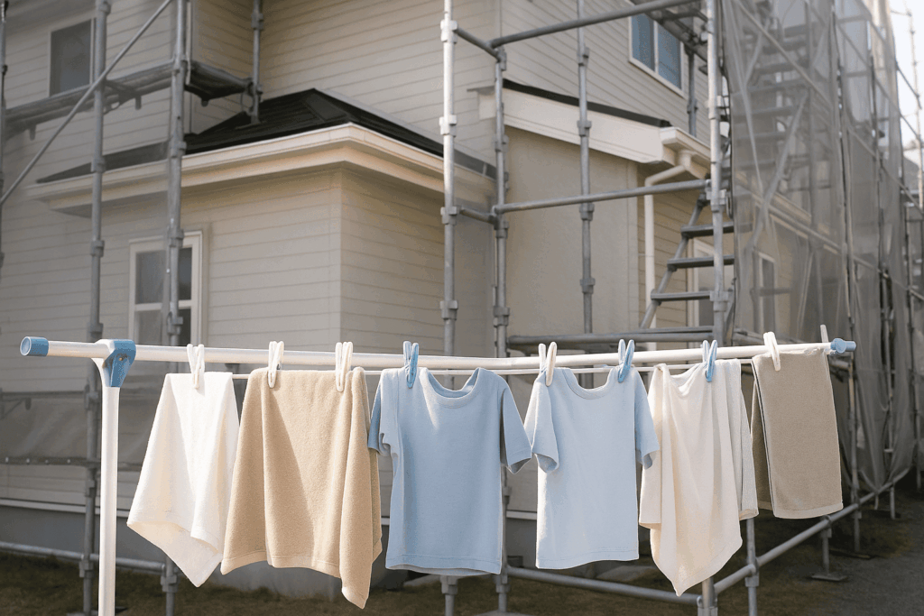 足場設置や高圧洗浄、塗装工程では塗料や水の飛散を防ぐため洗濯物を外に干せない日が発生します。