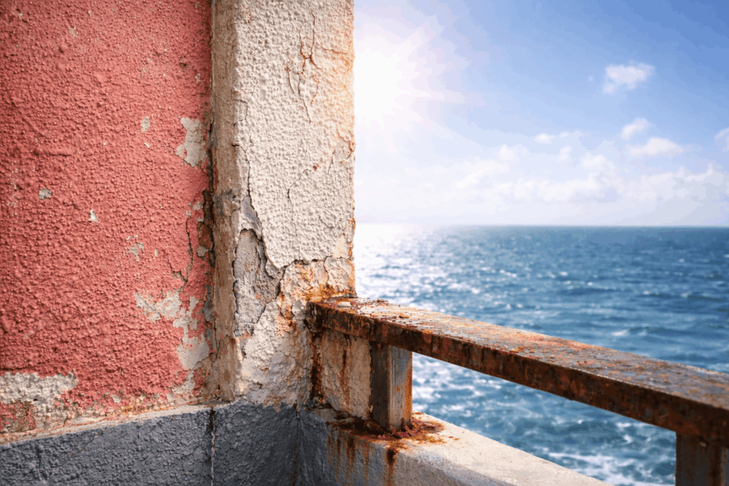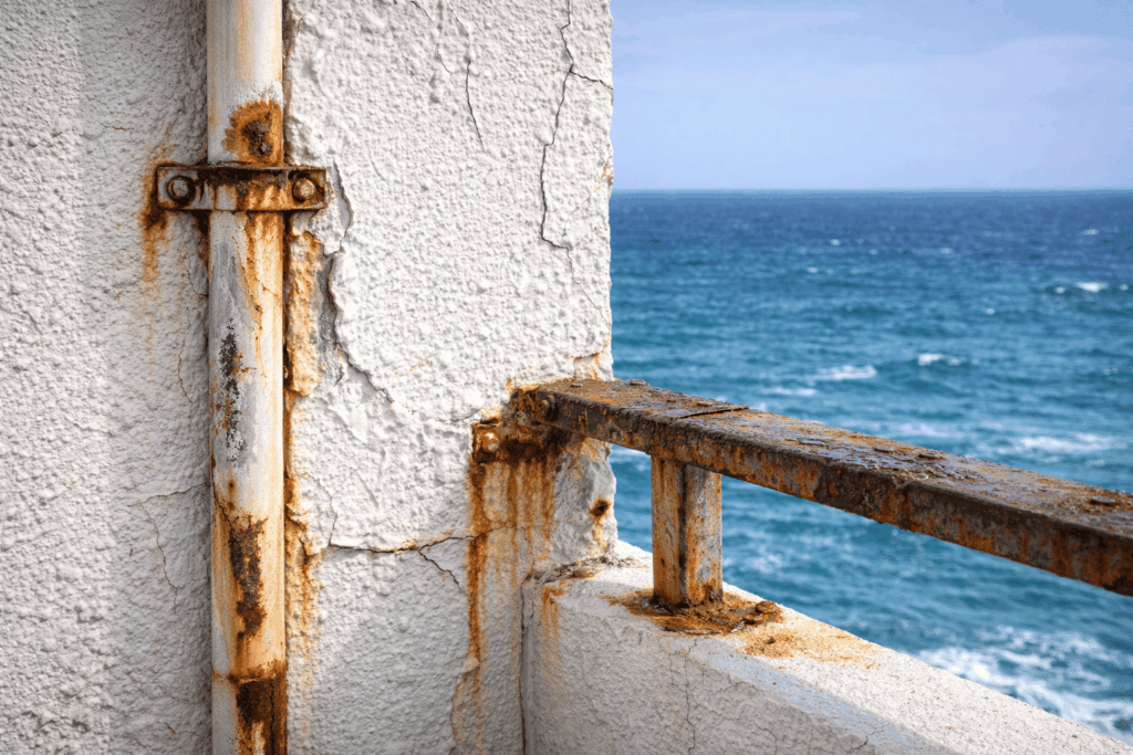 海からの塩分で金属部の錆や塗膜の早期劣化を招く