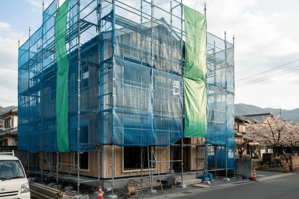 平塚市のように住宅が密集し、風の強い地域では、しっかりとした足場とメッシュ養生が不可欠